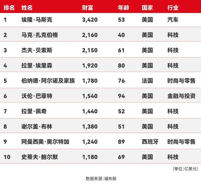 榜单显示,埃隆·马斯克身家达3420亿美元,排名第一;马克·扎克伯格(2160亿美元)排名第二,这也是他首次排名第二;亚马逊的杰夫·贝索斯(2150亿美元)位列第三;甲骨文的拉里·埃里森(1920亿美元)排在第四;阿尔诺(1780亿美元)因旗下奢侈品集团LVMH股价下跌,跌至第五位,这是他自2017年以来的最低排名。