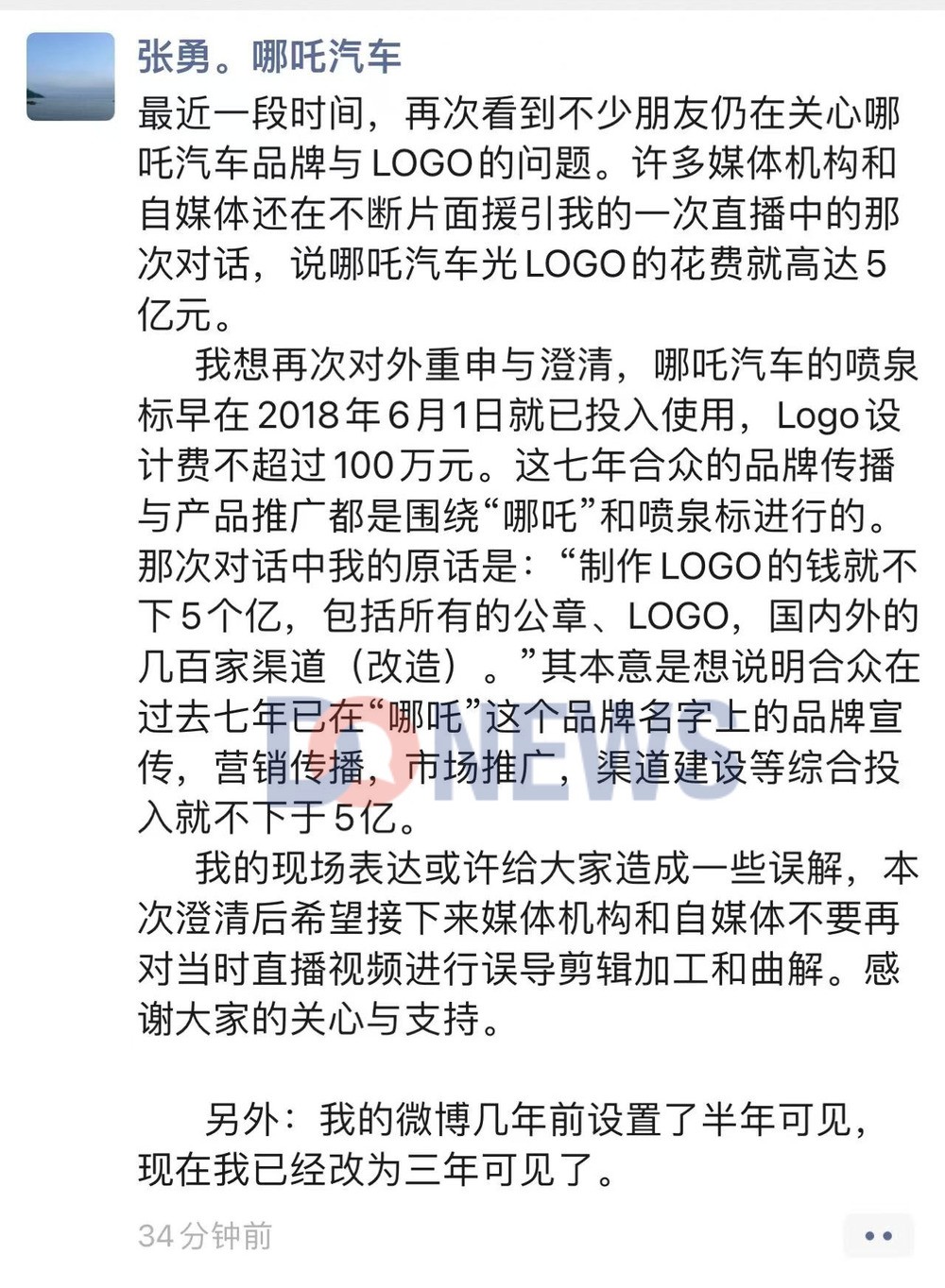4月18日消息,近期在社交平台上,哪吒汽车前CEO张勇花费5亿元设计公司Logo的相关言论被人重新翻出,并且倍遭舆论质疑。今日,张勇通过朋友圈进行了澄清,说自己当时现场表达给大家造成了误解,实际上Logo的设计费用不超过100万元,后期市场推广超过5亿。