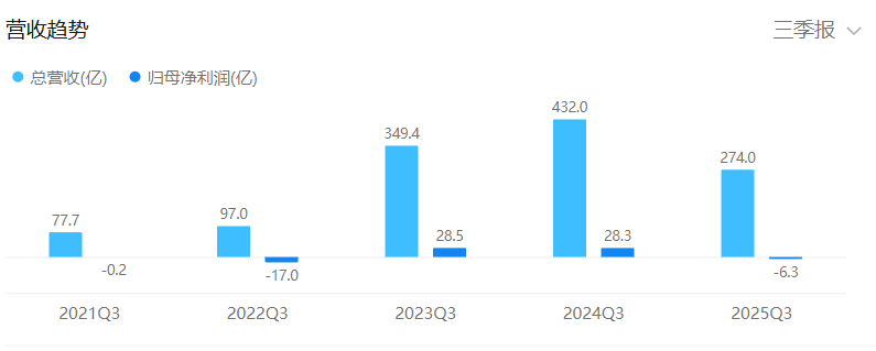 根据三季度财报和最新销量数据显示,理想三季度营收274亿元,交付9.32万辆,分别下滑36.2%、39%。更重要的指标数据是,它净亏损6.24亿,结束连续11季度的盈利纪录,重回亏损时代。