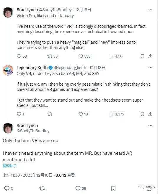 12月18日,国外XR硬件博主Brad Lynch发布推文,透露苹果在 Vision Pro 头显的岗前培训中,禁止员工使用“VR(虚拟显示)”词汇,并补充苹果公司仅禁用VR,并不禁止使用AR(增强现实)和XR(扩展现实),没有提及MR(混合现实)。