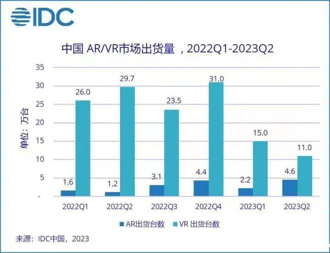 而在国内,IDC数据显示,2023年上半年AR出货6.8万台,同比上涨142%,VR出货26万台,同比下滑53.3%。